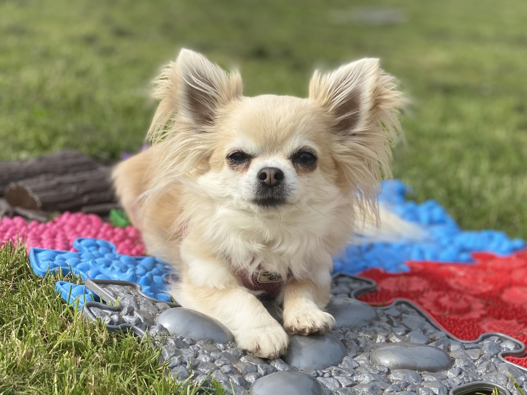 Ein Hund soll über eine instabile Unterlage gehen. Wenn seine Sinne gut zusammenarbeiten, fühlt sich die Situation sicher an – er bewegt sich ruhig und kontrolliert.